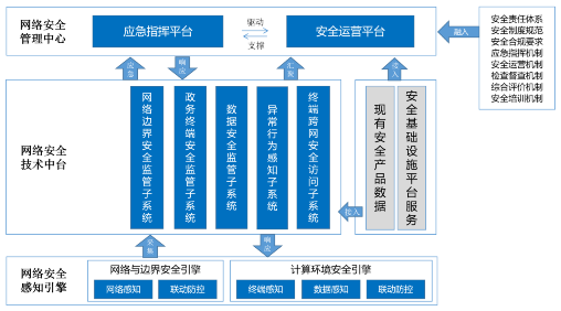 安全管理中心依據網(wǎng)絡(luò )安全等級保護相關(guān)要求建設,涉及系統管理、安全管理、審計管理等方面。同時(shí),安全管理中心下分設應急指揮平臺和安全運營(yíng)平臺,以此來(lái)落實(shí)網(wǎng)絡(luò )和信息安全突發(fā)事件應急處置以及網(wǎng)絡(luò )安全和數據安全日常運營(yíng)工作,實(shí)現網(wǎng)絡(luò )安全統一管理、統一監控、統一審計、綜合分析和協(xié)同防護。
