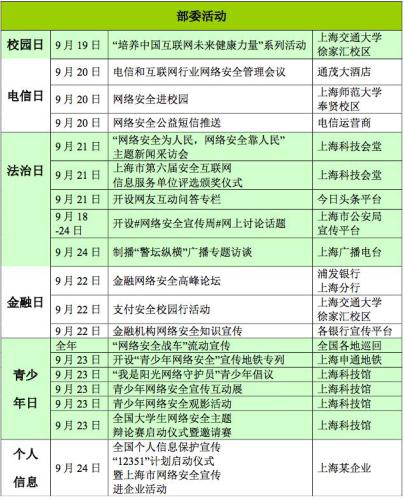 ? ? ? 9月19日至24日,教育部、工業(yè)和信息化部、公安部、人民銀行、共青團中央、全國總工會(huì )將分別組織開(kāi)展校園日、電信日、法治日、金融日、青少年日、個(gè)人信息保護日等主題日活動(dòng)。