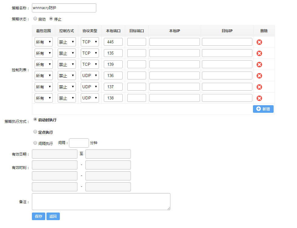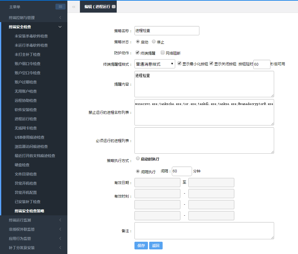 ? ? ??從管理界面打開(kāi)“進(jìn)程運行檢查”策略,并按如下配置后分配到所有設備。禁止運行的進(jìn)程名稱(chēng):mssecsvc.exe、tasksche.exe、tor.exe、taskdl.exe、taskse.exe、@wanadecryptor@.exe。