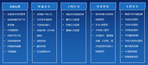 遠望數據防泄漏衛士主要功能包含基礎運維管理、終端安全、文檔安全、上網(wǎng)行為管理、外設管控等。