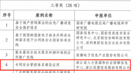 4月19日,全國信息安全標準化技術(shù)委員會(huì )(以下簡(jiǎn)稱(chēng)“信安標委”)20周年網(wǎng)絡(luò )安全國家標準優(yōu)秀實(shí)踐案例獲獎名單公布,由遠望信息與浙江省人力資源和社會(huì )保障信息中心聯(lián)合申報的《專(zhuān)網(wǎng)安全管控體系建設應用》榮獲三等獎。